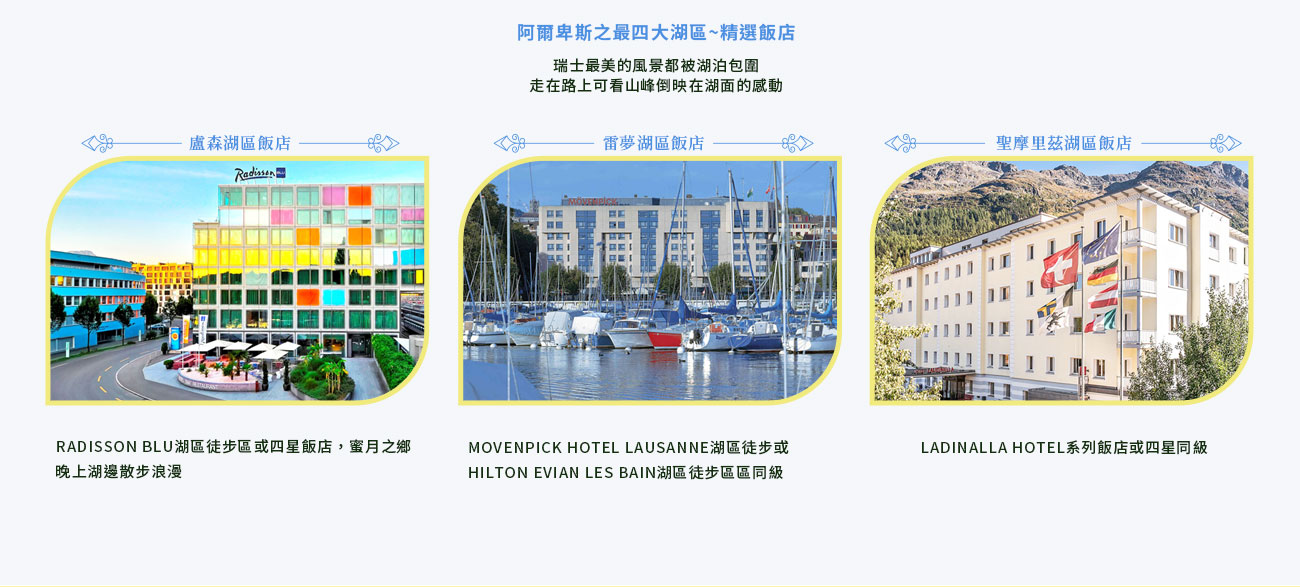 住宿:METROPOLE因特拉肯區/HOTEL-RESTAURANT KREUZ & POST岩石森林區/SILBERHORN WENGEN溫根山區/DELTA PARK圖恩湖區 或 (4★)或同級連泊第一晚