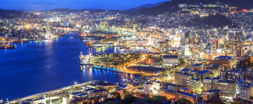 被長崎市環抱其中的長崎港,以及周圍群山環繞的奇特地形造就了富有立體層次之美的夜景。從稻佐山展望台就能以360度全景飽覽這個只屬於長崎的絕美夜景。白天,可以眺望長崎海灣和遠處的雲仙、天草和五島列島;日落時分,整個長崎市被晚霞染紅的景色更令人沉醉。