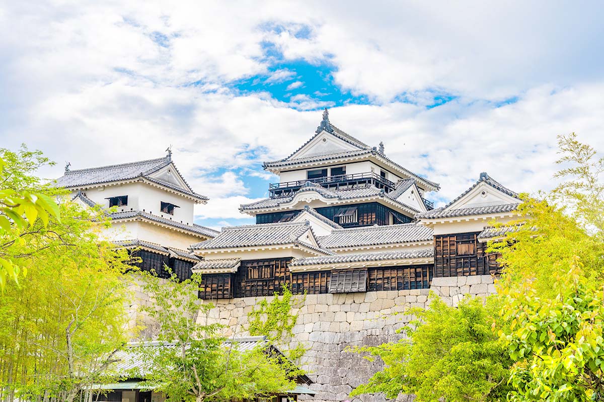 【松山城】松山城位於松山市中心地帶、海拔132公尺的勝山上。山頂上建有本丸,山麓原野則有成為史蹟庭園的二之丸,以及作為堀之內公園備受喜愛的三之丸。在關原之戰活躍的加藤嘉明為初代藩主,他自慶長7年(1602年)起花費長達四分之一世紀建城,使其成為「現存十二天守」之一,城內擁有21棟重要文化財。
